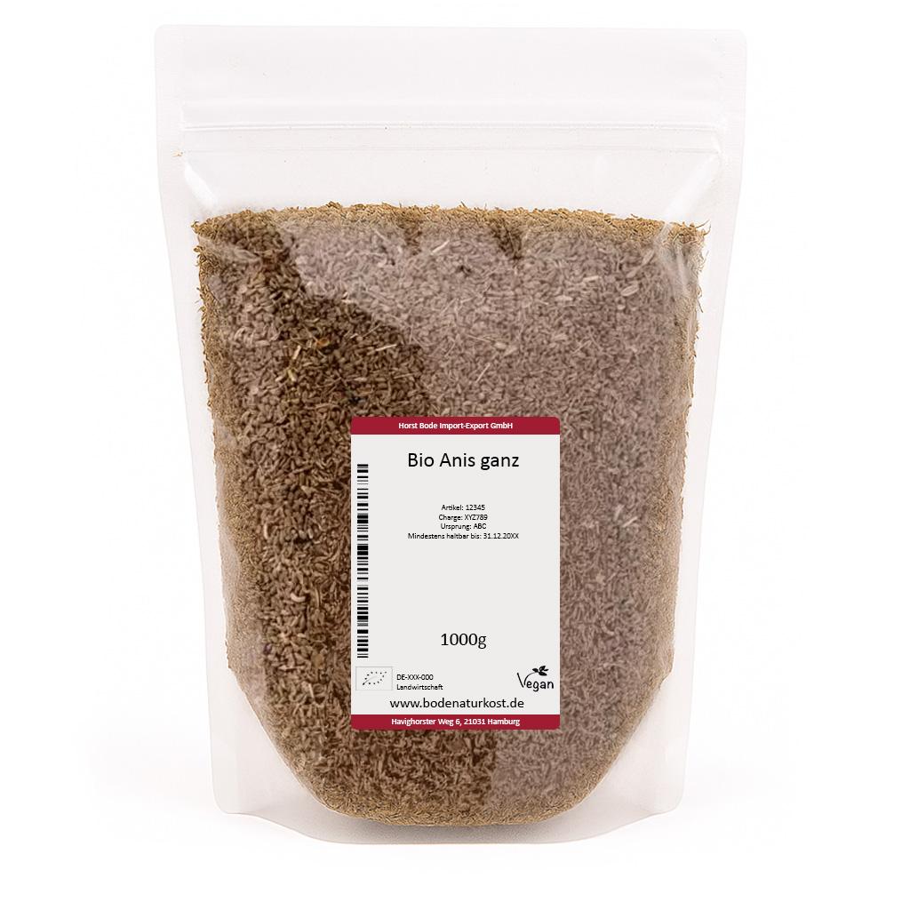 Hela anisfrön. Växten härstammar ursprungligen från Asien och sydöstra Medelhavsländerna. De ljusgula till grönbruna fröna har en sötaktig och lätt lakritsartad smak. De ingår i många