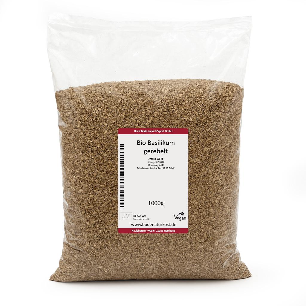 Torkade finhackade basilikablad. Basilika, även känt som basilie, basilienkraut eller kungskraut, är en kryddväxt och en nödvändighet för varje kök. Många italienska rätter, som till exempel tomatsås, pasta, pesto eller pizza, är svåra att föreställa sig utan basilika. Den är lämplig för matlagning och stekning.