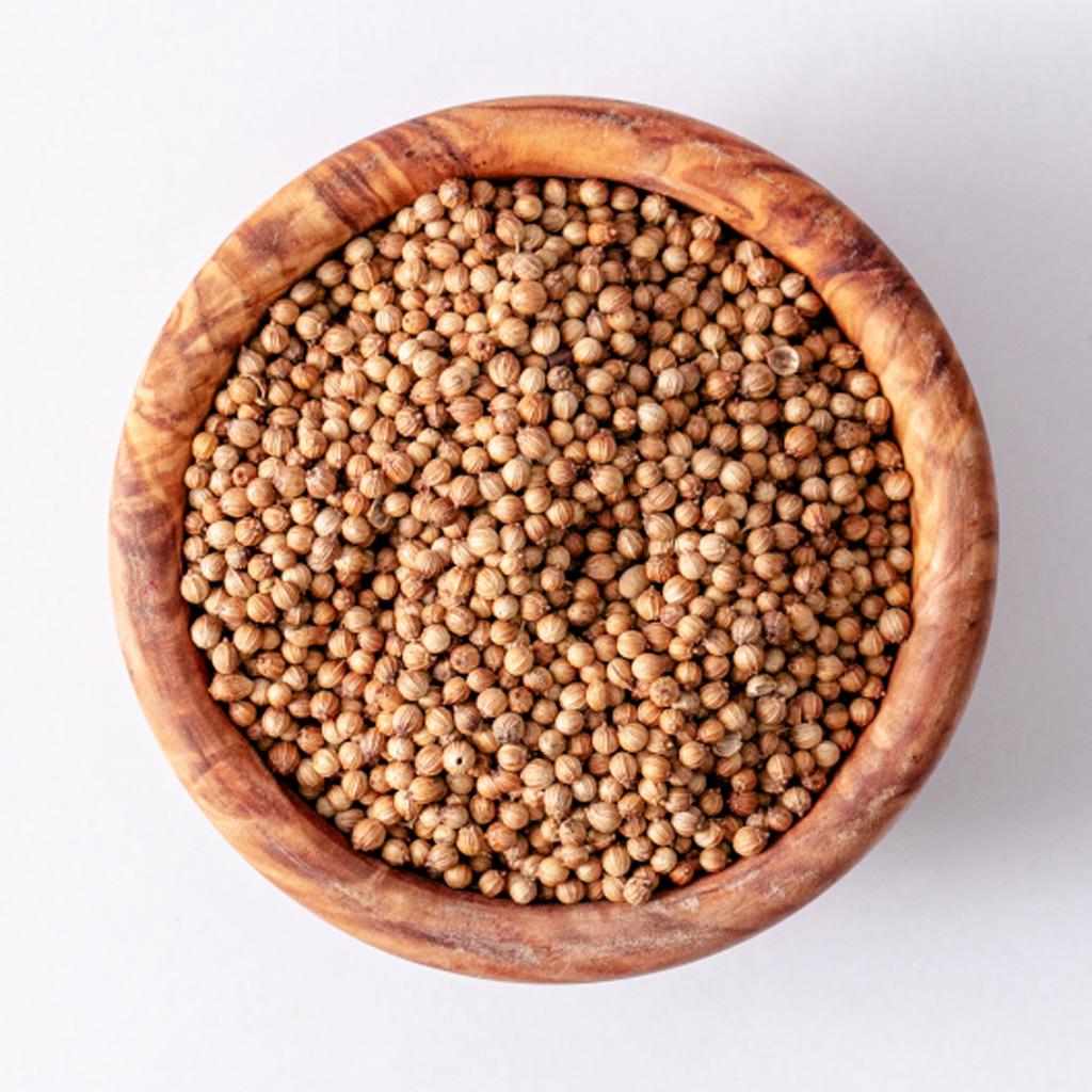 De hela torkade korianderfröna har en gulbrun färg, är rundade och har en smak som starkt påminner om senap. Koriander förekommer i rätter från den indiska, arabiska och asiatiska köket och kombineras ofta med muskotnöt, fänkål, peppar, chili, kryddnejlika, ingefära och kummin. Den används även i bakverk, till exempel i kryddblandningar för surdegbröd och julgodis.
